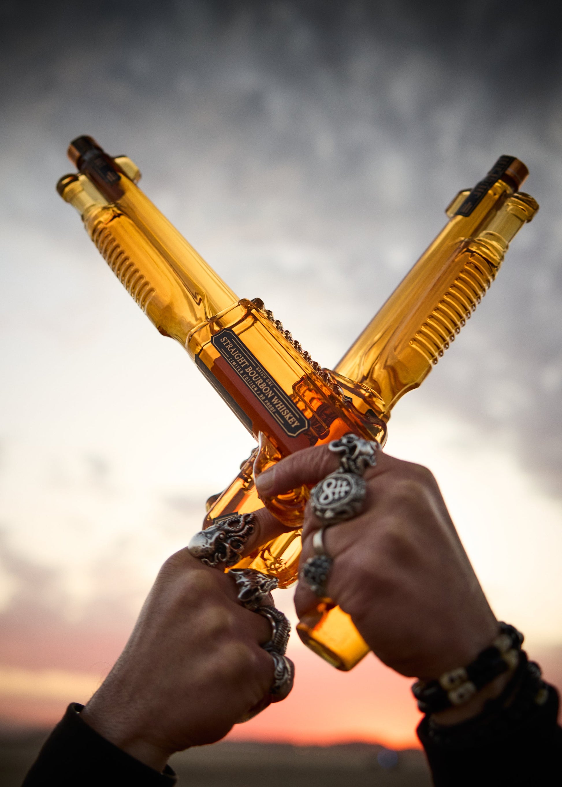 2 x 500ml sawed-off shotgun whiskey bottles.
